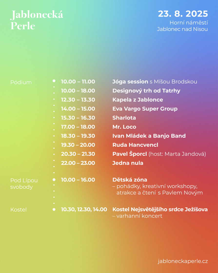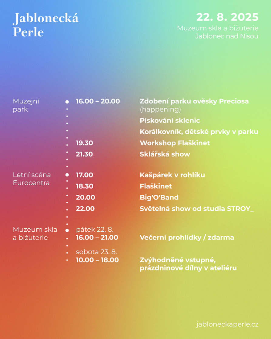 Letní městská slavnost Jablonecká Perle se vrací do ulic Jablonce! V pátek a sobotu 22. a 23. srpna 2025 ožije centrum města hudbou, světly, sklem a bižuterií. Po loňském úspěchu se do programu vrací také Den s muzeem, který v pátek nabídne jedinečný zážitek pro celou rodinu – v duchu tvořivosti, řemeslného umění i zábavy pod širým nebem.