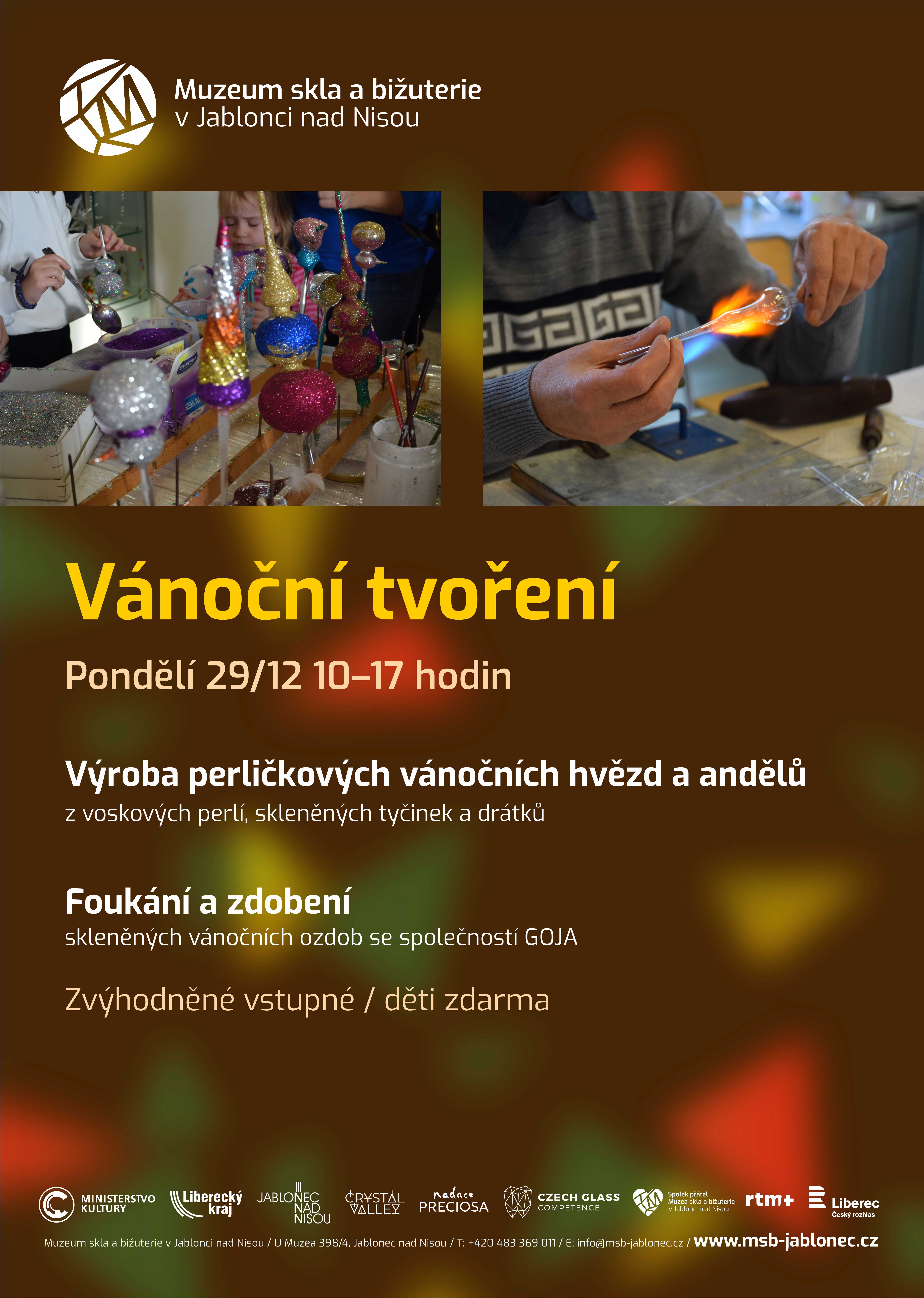 Od 10 do 17 hodin bude připravena rodinná muzejní dílna s výrobou perličkových vánočních hvězd a andělů z voskových perlí, skleněných tyčinek a drátků. Přijďte si vyrobit originální dekoraci tradiční jabloneckou technikou.