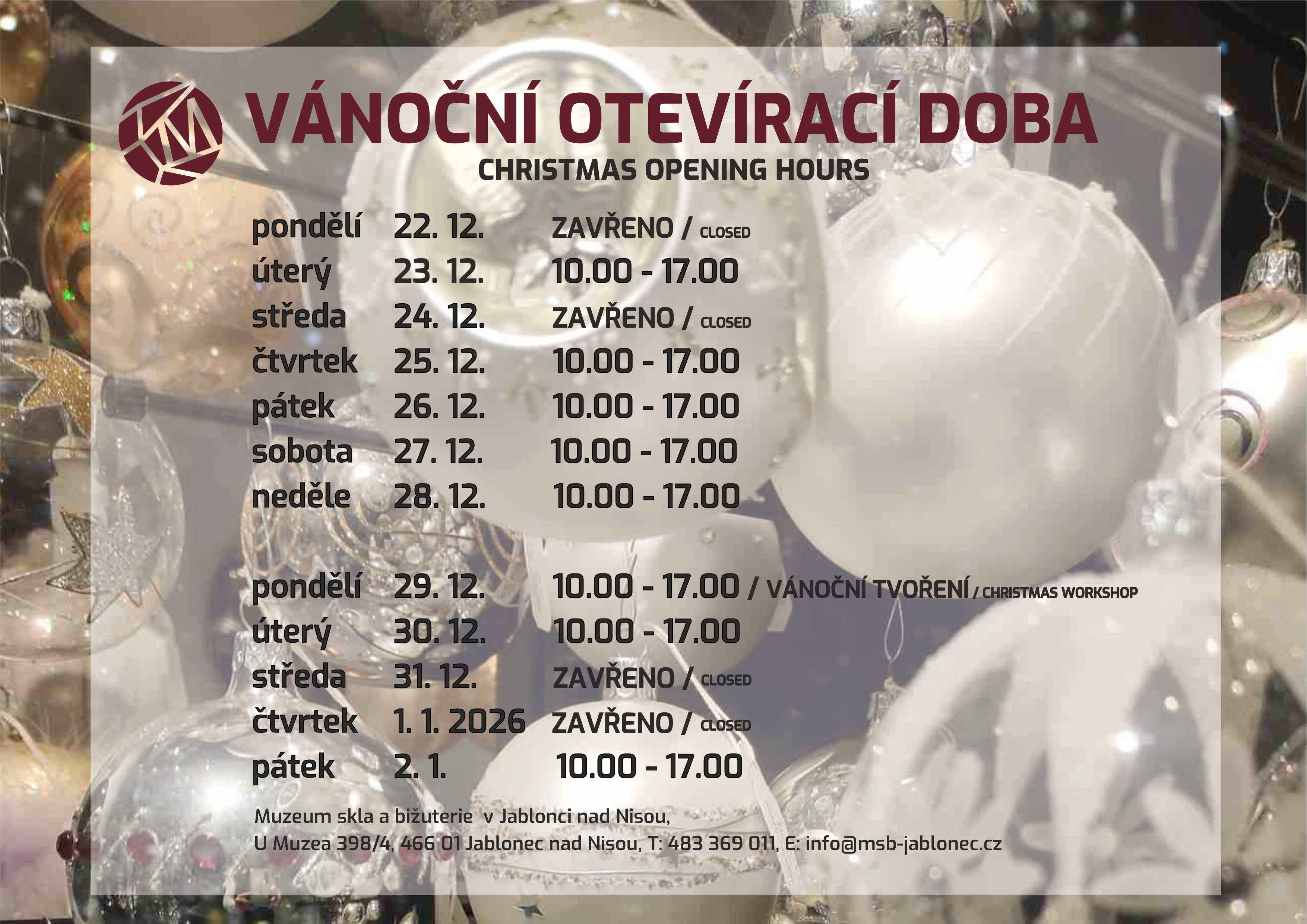 Milí návštěvníci, během vánočních svátků pro vás máme upravenou otevírací dobu. Přijďte si užít sváteční atmosféru, prohlédnout si výstavy nebo vybrat drobný dárek v našem muzejním obchůdku.
